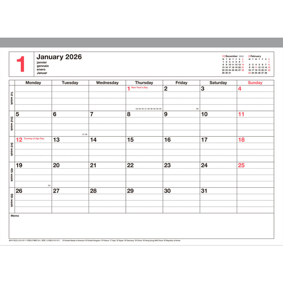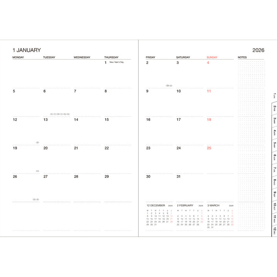 Planifiez et organisez vos semaines et mois avec ce calendrier 2026 en grand format. Grâce à sa visualisation au mois, sa conception simple et ces pages de notes, vous pourrez avoir un aperçu de toutes les dates les plus importantes grâce à cette planification annuelle.
