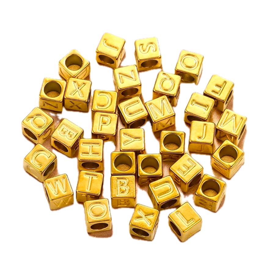 Chaque cube est en acier inoxydable doré, gravé d’une lettre pour créer des mots, des initiales ou un petit message secret. À glisser sur une chaîne, un cordon, ou même un ruban bref, l’accessoire parfait pour une touche unique.