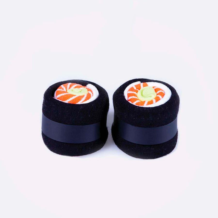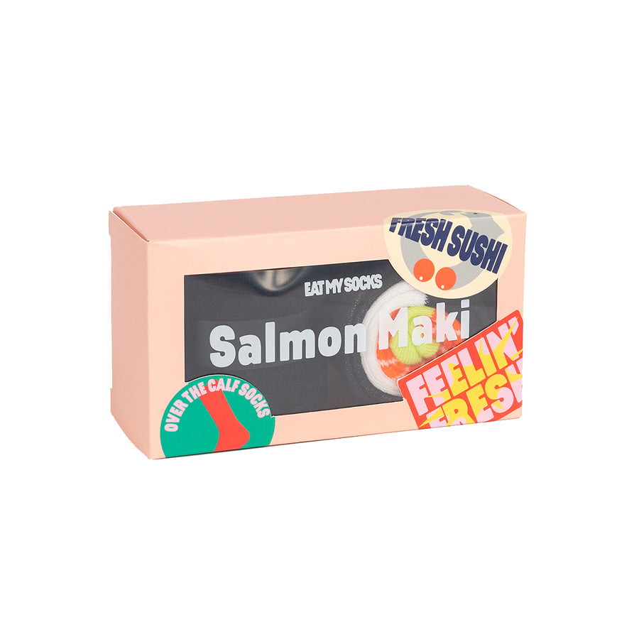 La boite de chaussettes Maki au saumon de la marque Eat my socks. Ce coffret contient 1 paire de chaussettes présentées comme un plateau de salmon makis. Les chaussettes sont mi-longues.
