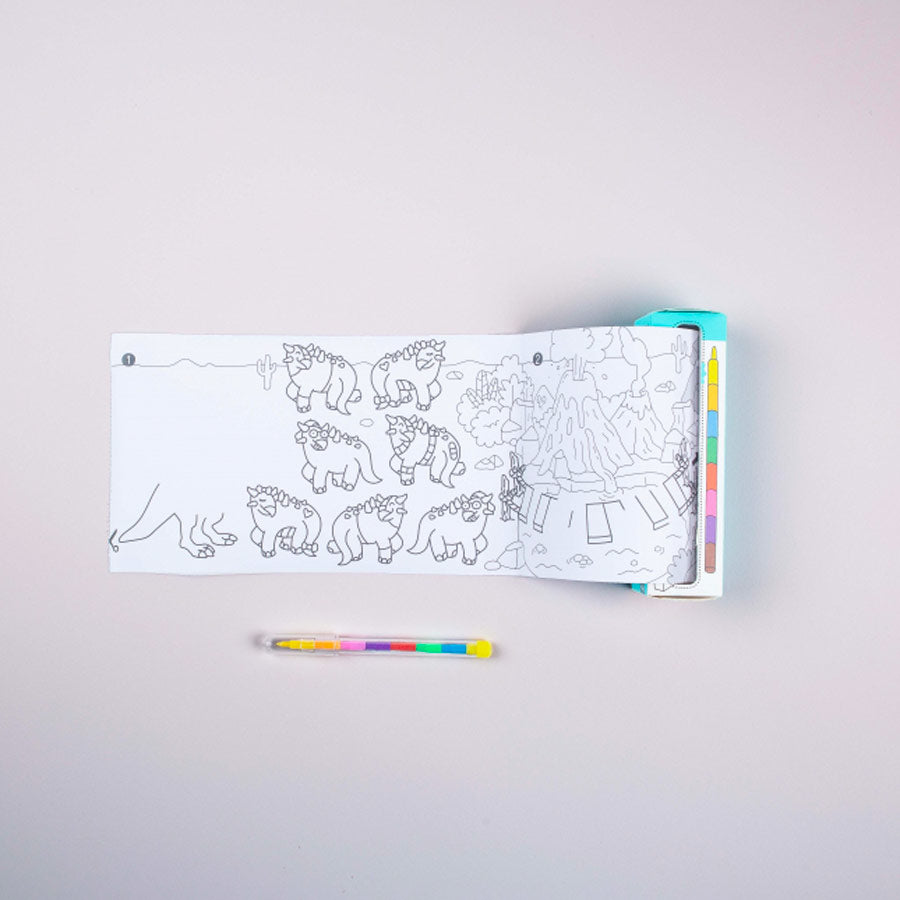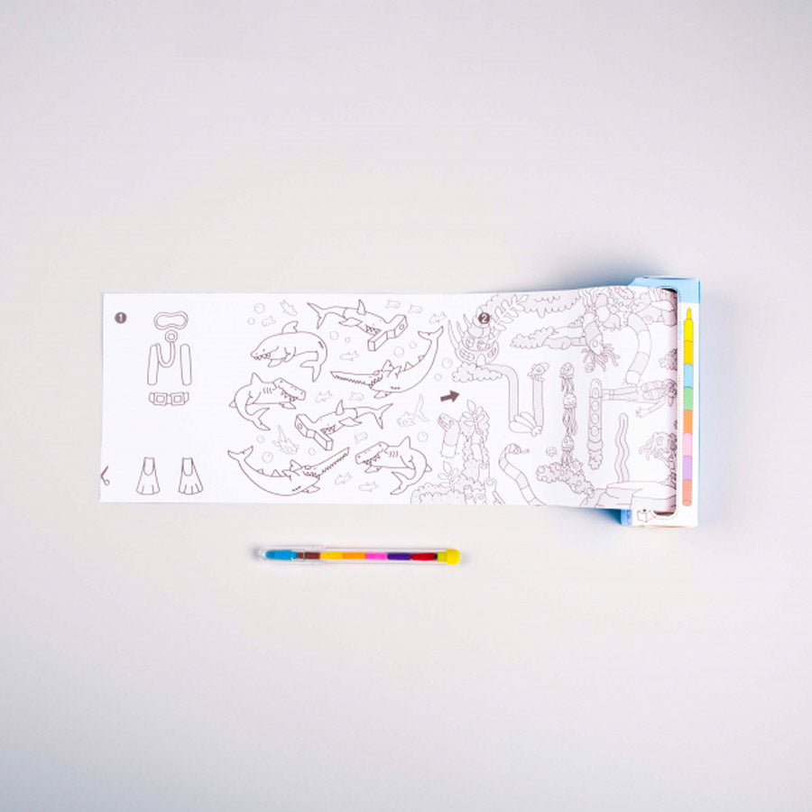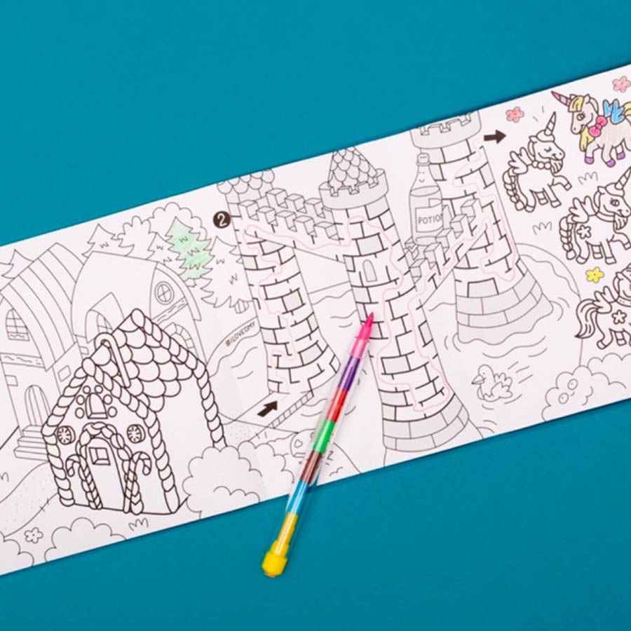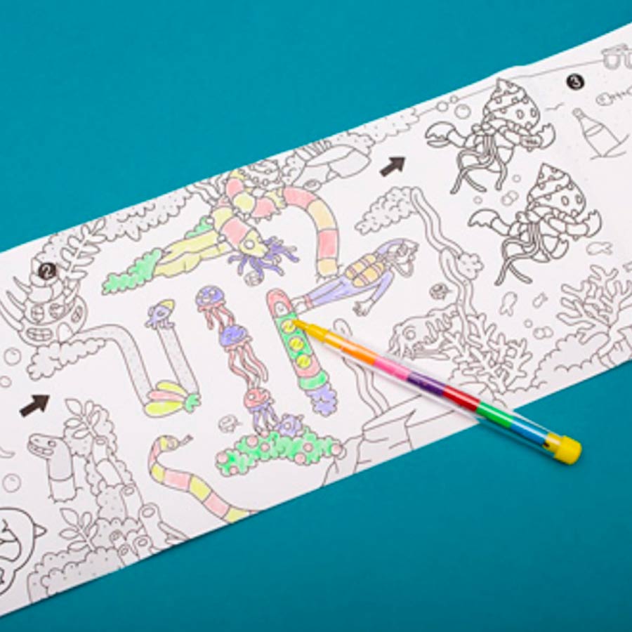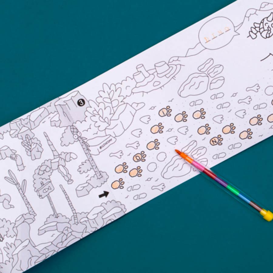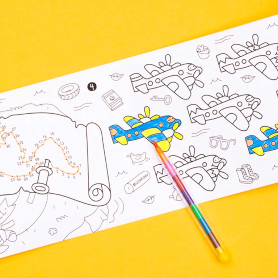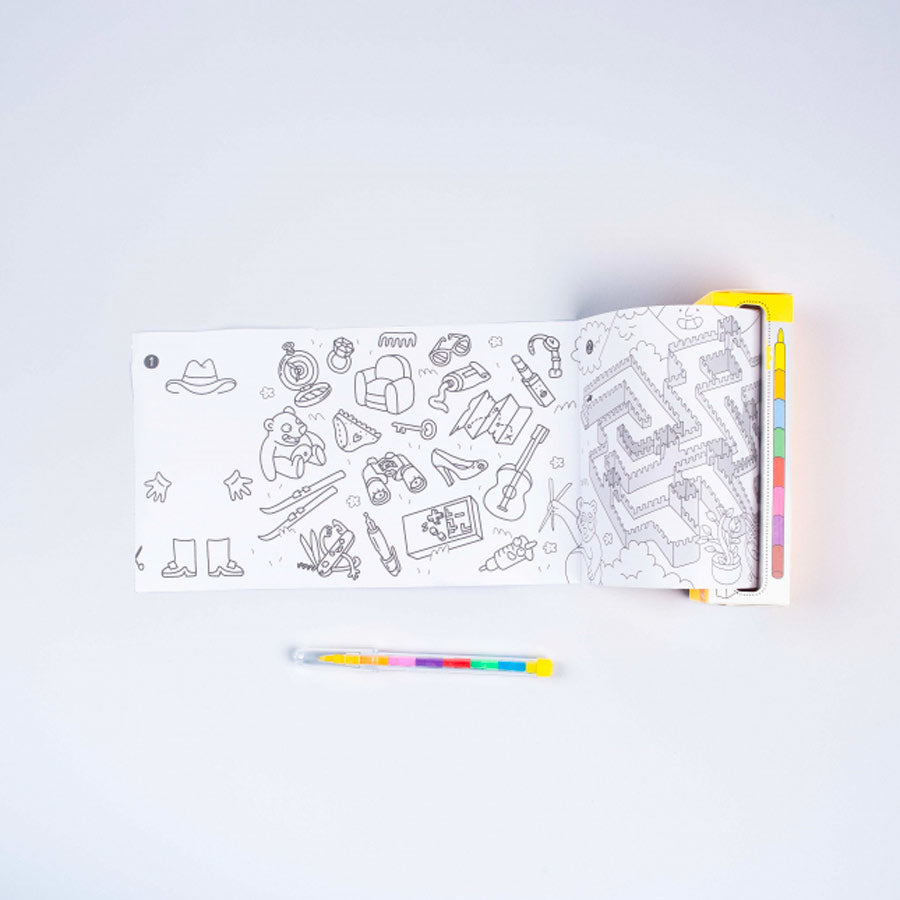 Le kit comprend un rouleau de fiches détachables avec des coloriages et des jeux sur une thématique et un stylo avec des mines de différentes couleurs.