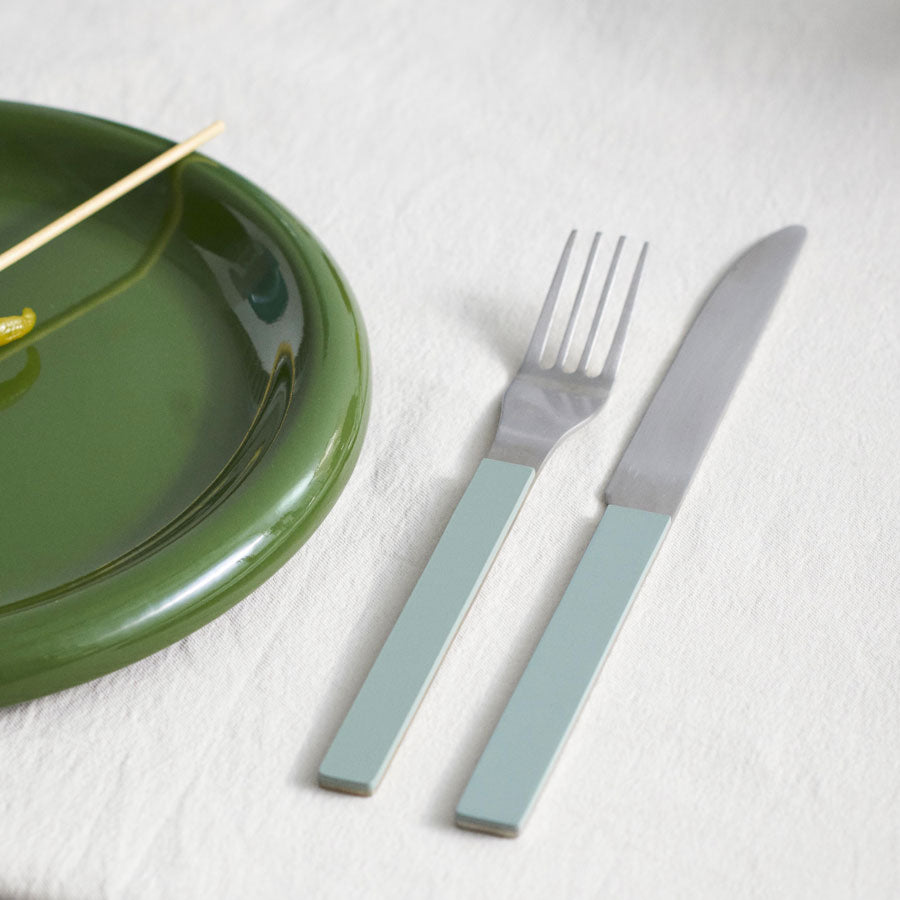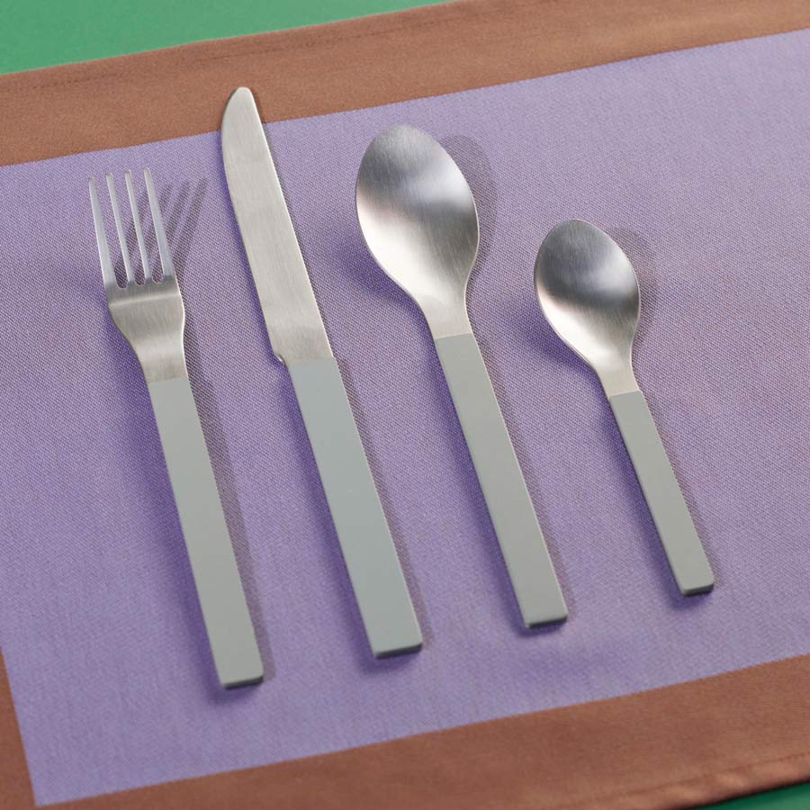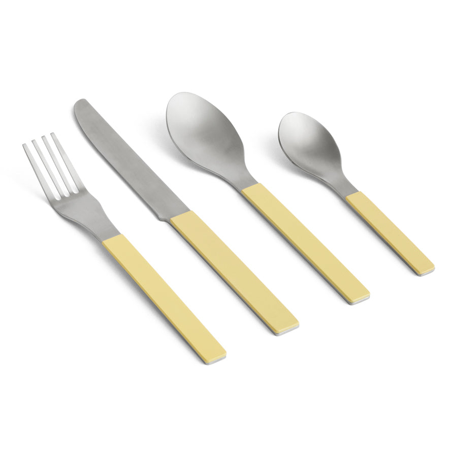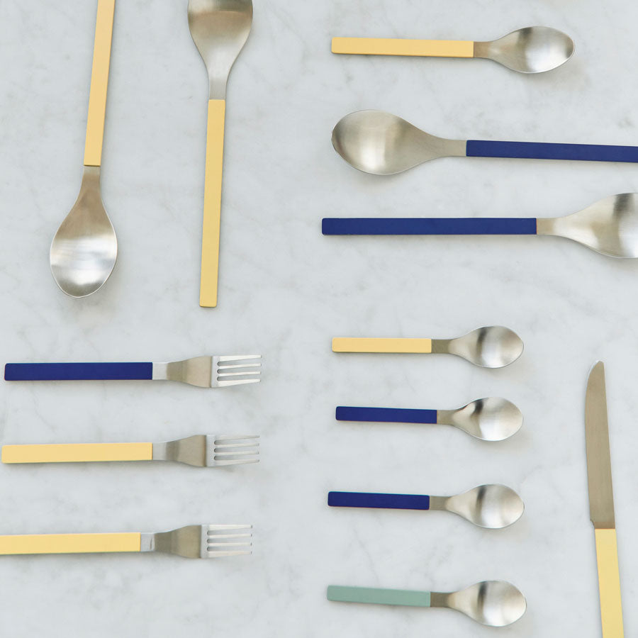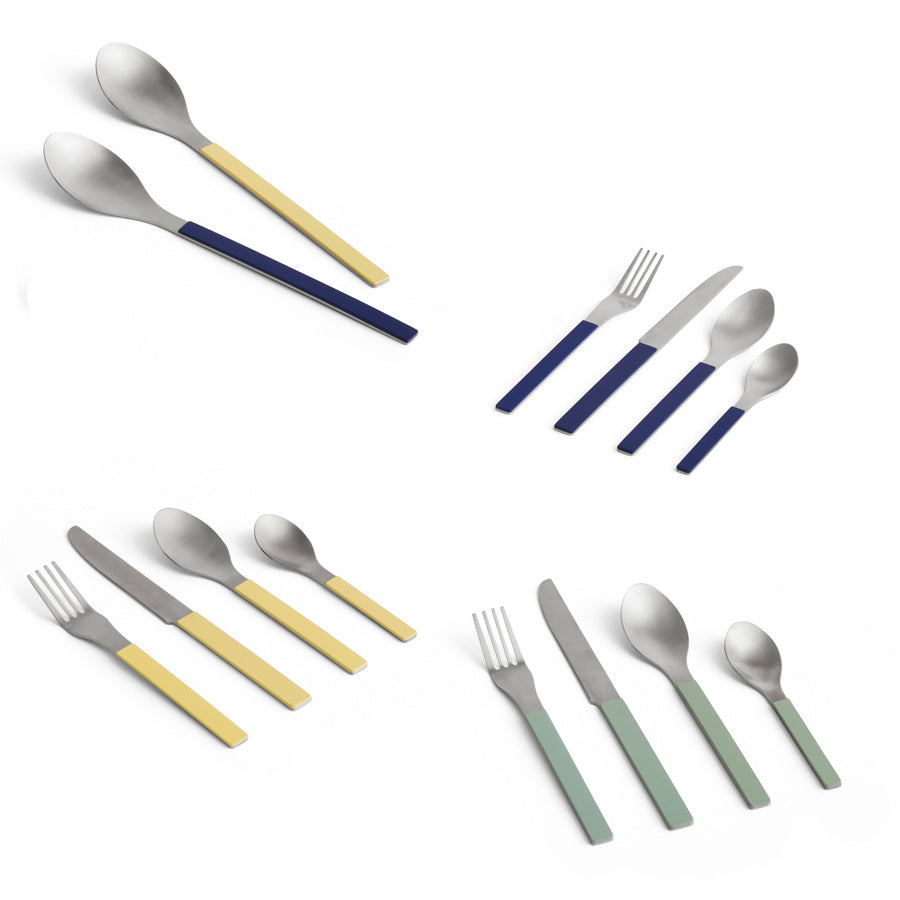 Fabriqués en acier inoxydable brossé, les manches de ces couverts sont peints pour une touche de style supplémentaire. L'ensemble comprend quatre pièces essentielles pour chaque repas : un couteau, une fourchette, une cuillère et une cuillère à café.