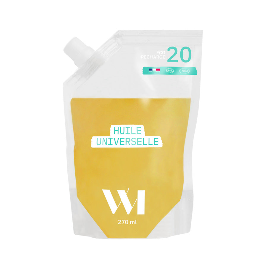 L'éco-recharge d'huile universelle pour remplir votre flacon. L'utilisation d'éco-recharge vous permet de réduire de 70% la consommation de plastique et de toujours en avoir en réserve.