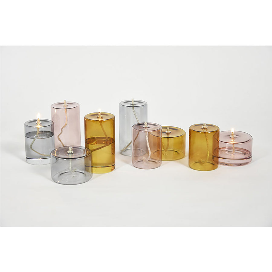 Ces lampes à huile sont composées de verre teinté et sont disponibles en trois couleurs : ambre, gris fumée et rose. Faites votre propre combinaison pour votre décoration.