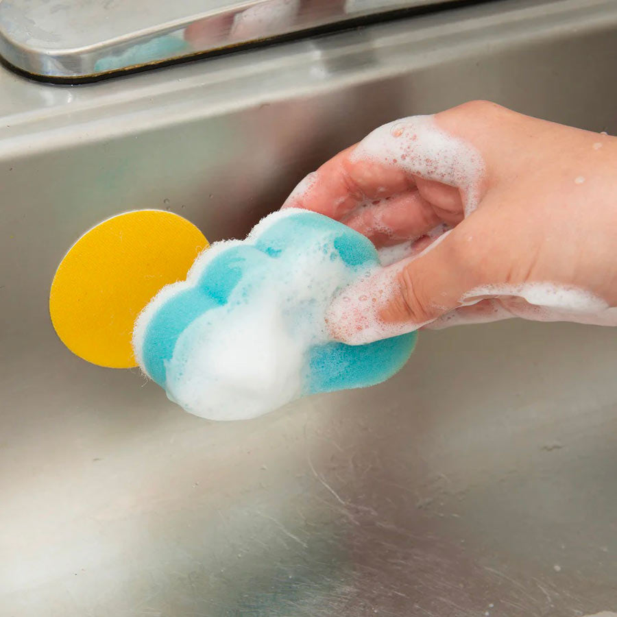 Apportez une touche de couleur dans votre cuisine avec cette éponge nuage. Cette éponge vous permettra de faire la vaisselle sans la rayer. Une de ses faces vous permettra également de récurer. Son support en forme de soleil se fixe dans l'évier et grâce à un scratch, on accroche facilement l'éponge.