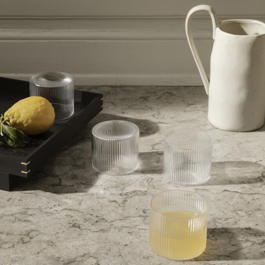 Cet ensemble de 4 verres bas transparent est issu de la collection Ripple de la marque Ferm Living. Élégants et design, ils se distinguent par leurs belles surfaces nervurées et par leurs tailles basses. Ils sont soufflés à la bouche dans un moule texturé, montrant une esthétique géométrique qui crée un jeu de lumière irisé à chaque utilisation.