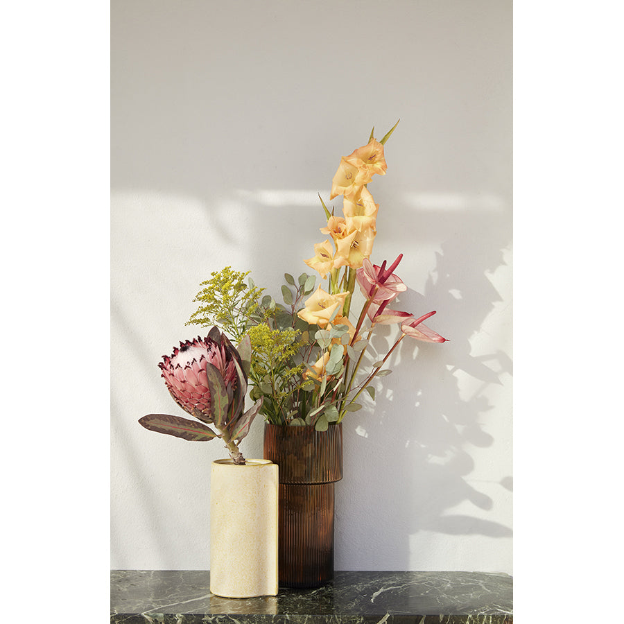 Ce vase cylindrique et son élégance s’intégreront parfaitement à votre belle décoration sur une étagère ou un meuble par exemple. Mais aussi, avec un beau bouquet de fleurs. Avec ses reflets ambrés et son verre nervuré, ce vase attire l'attention et rappellent le design rétro des années 70.
