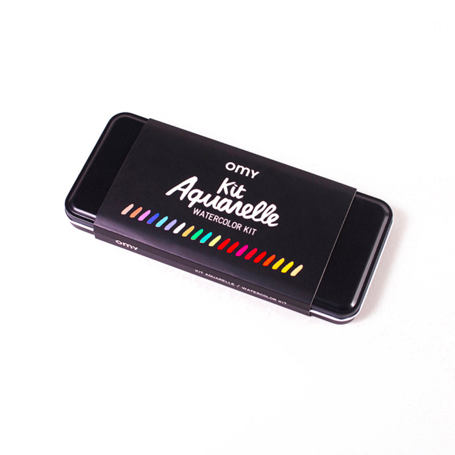 Envie de vous initiez à l'aquarelle ? Découvrez le Kit aquarelle contenant 24 couleurs de chez Omy. Ce qui comprend 24 carrés de couleurs, un pinceau avec réservoir inclus et une éponge.