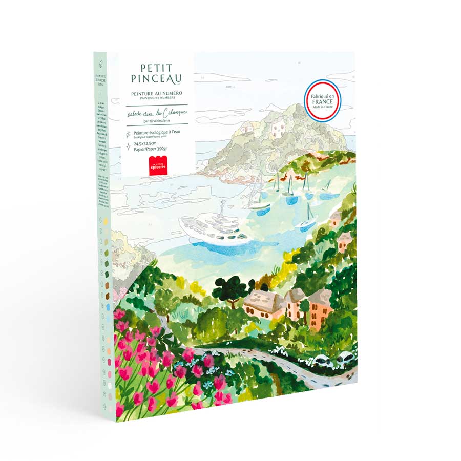 Découvrez Le kit de peinture au numéro Balade dans les Calanques de La petite épicerie. En collaboration avec l'illustratrice Sabina Fenn, ce set de peinture à faire soi-même est composé d'une illustration numérotée, de pots de peintures et de deux pinceaux.