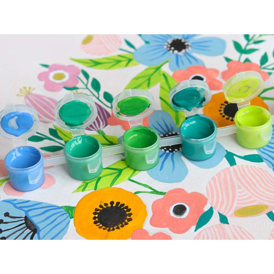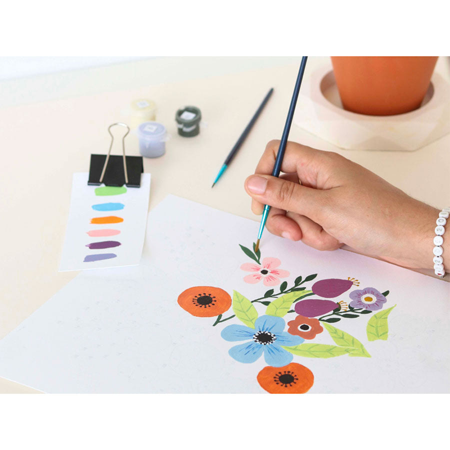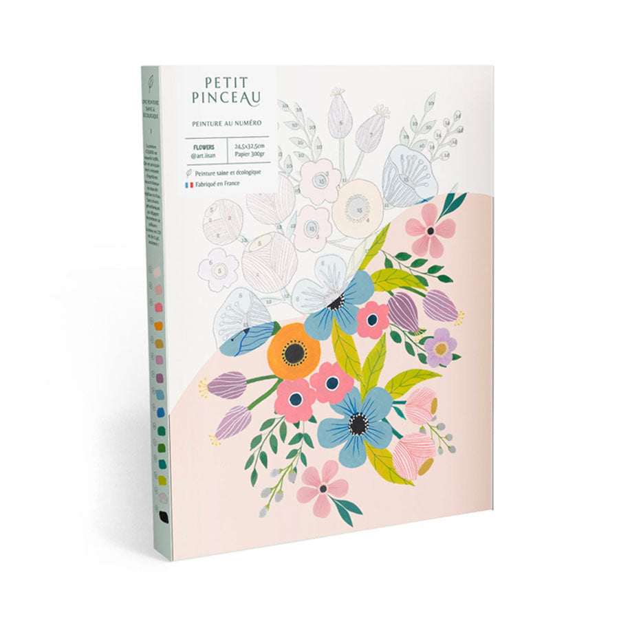 Le kit de peinture au numéro Flowers est né de la collaboration entre l'illustratrice Artiisan et la petite épicerie. Ce set de peinture à faire soi-même est composé d'une illustration numérotée, de pots de peintures et de deux pinceaux.