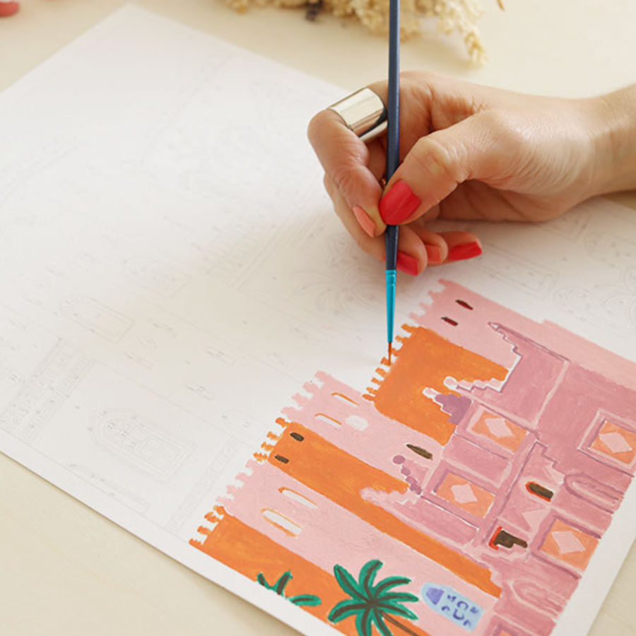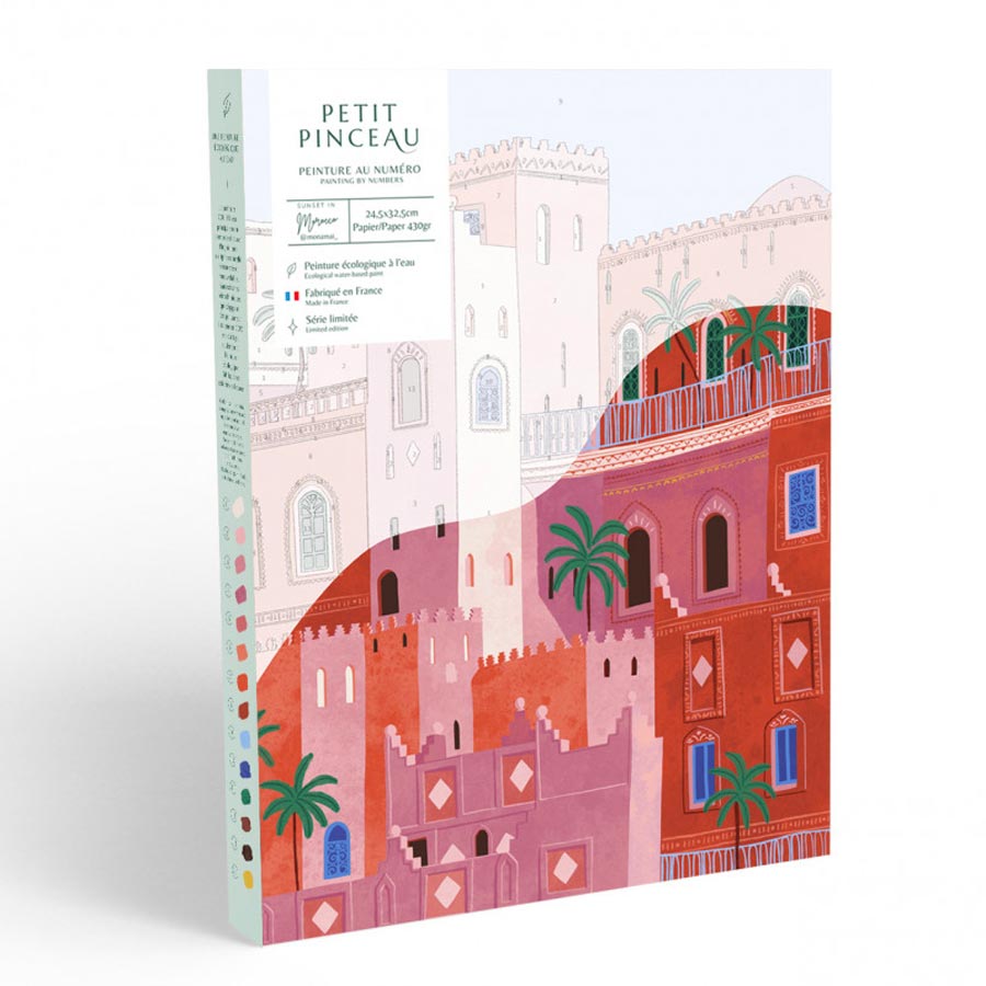 Le kit de peinture au numéro Maroc est né de la collaboration entre l'illustratrice MonaMai et la petite épicerie. Ce set de peinture à faire soi-même est composé d'une illustration numérotée, de pots de peintures et de deux pinceaux.