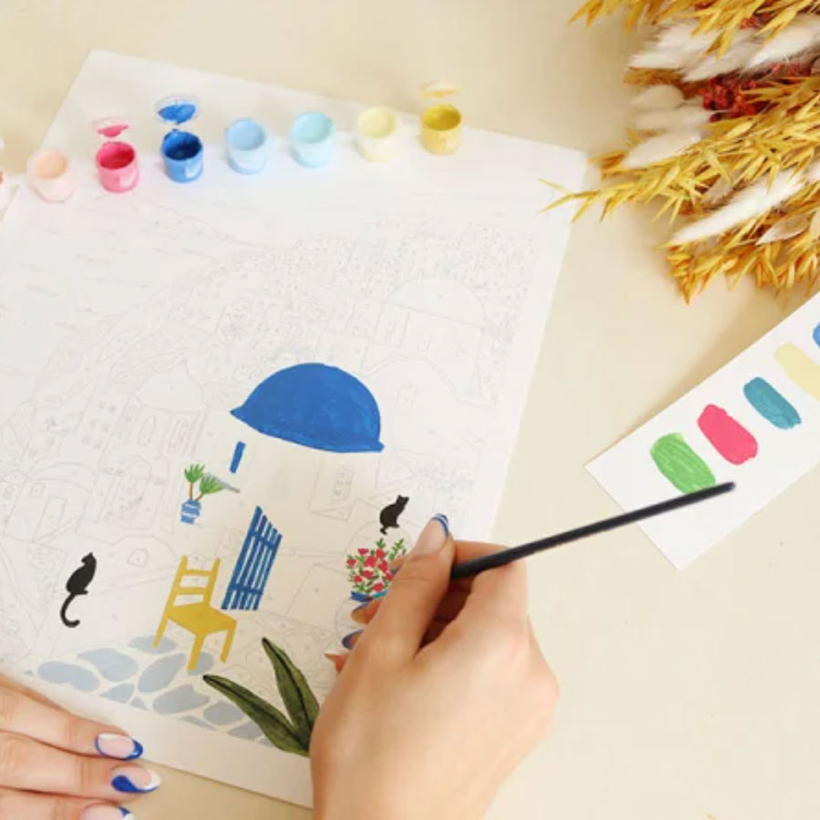 Ce coffret de peinture au numéro Santorini vous permettra de réaliser une magnifique illustration. C'est une activité manuelle qui convient aux adultes et aux enfants.