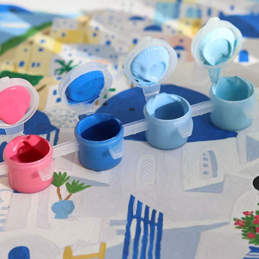 Le kit de peinture au numéro Santorini est né de la collaboration entre l'illustratrice Maja Tomljanovic et la petite épicerie. Ce set de peinture à faire soi-même est composé d'une illustration numérotée, de pots de peintures et de deux pinceaux.