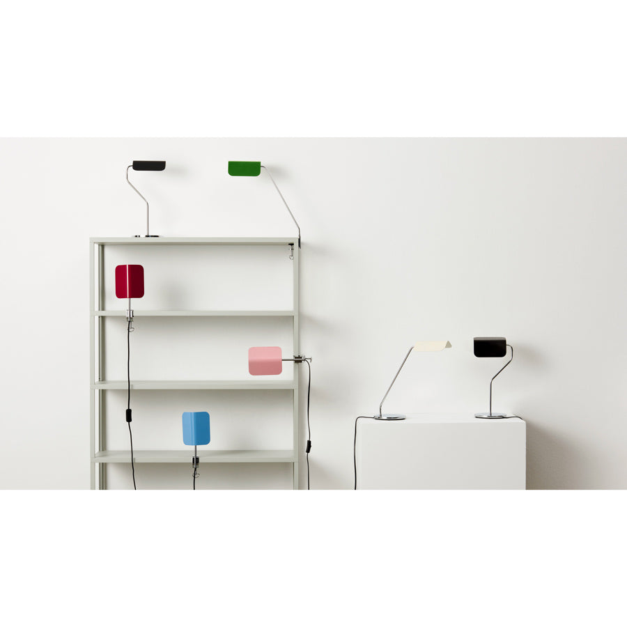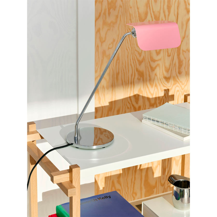 La lampe de bureau sur pied Apex est composée d'un bras et d'un socle en acier chromé que l'on vient poser sur le bureau. L'abat jour en acier laqué reprend la forme d'un toit à deux pentes, il pivote à 360° afin de pouvoir facilement diriger la lumière.