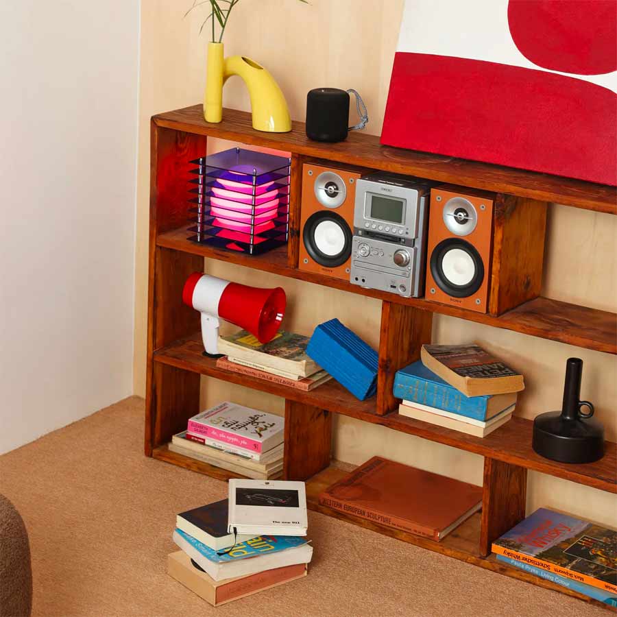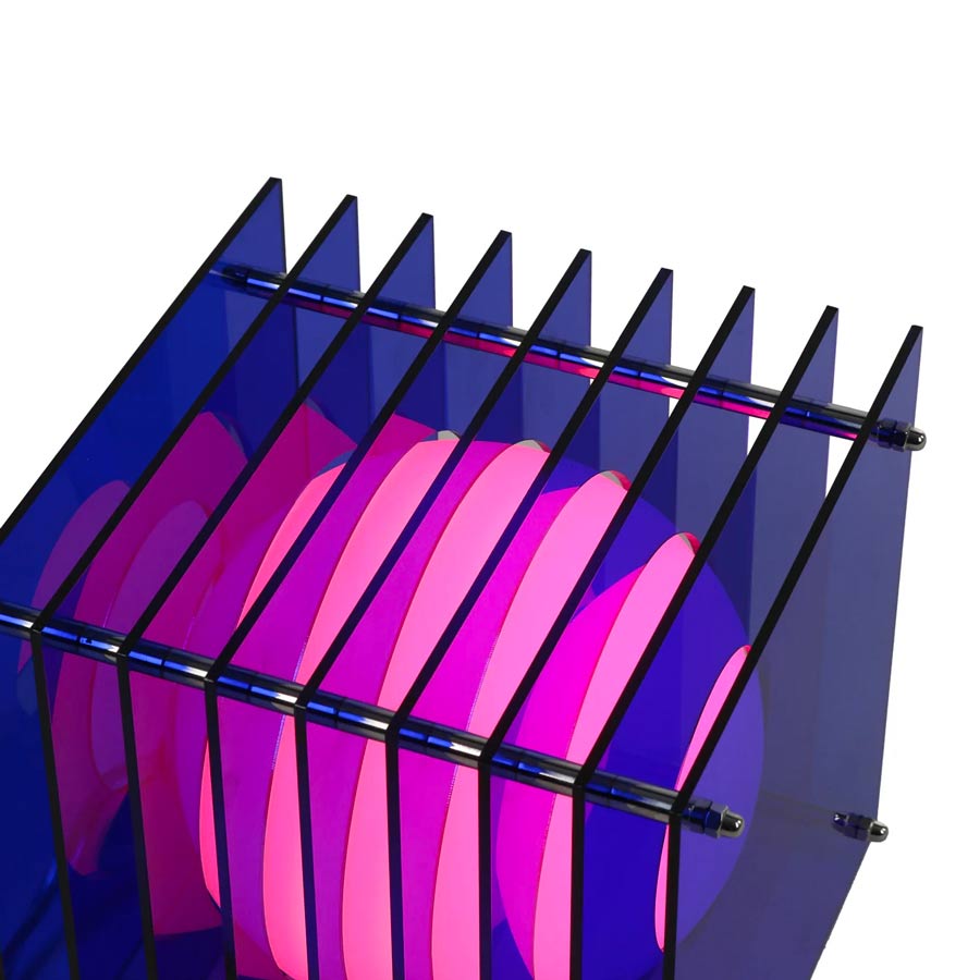 Une fois allumée, la sphère reste immobile mais ses reflets dans les plaques créent un mouvement lumineux subtil, presque magique. On pense à une lanterne futuriste, à une maquette architecturale, voire à un objet issu d’un film de science-fiction rétro.