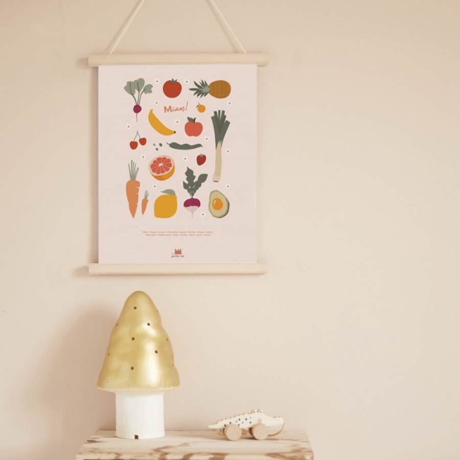 Une affiche pédagogique avec de jolies illustrations pour apprendre les fruits et légumes. Cette illustration colorée et vitaminée s'intégrera parfaitement dans la chambre de vos enfants. Un moyen ludique de découvrir les goûts et les couleurs et qui sait, peut-être que les poireaux passeront mieux dans l’assiette !