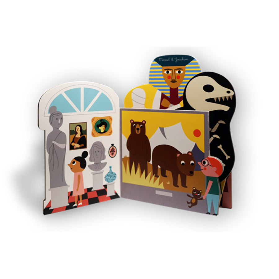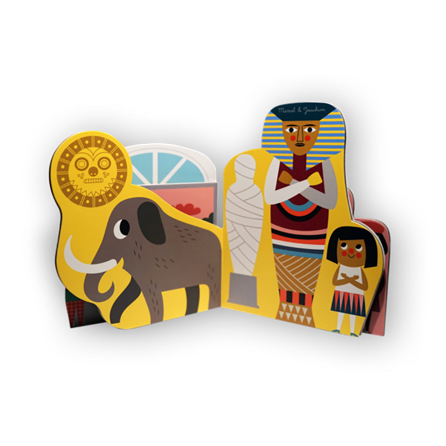 L'imagier Au Musée cartonné et sans texte pour les bébés, illustré par Ingela P Arrhenius édité par Marcel et Joachim, maison d'édition indépendante pour la jeunesse. Un imagier bébé sans texte en carton épais avec des pages découpées, entre le livre cartonné et l’objet. Momies, squelettes de dinosaures, mammouth naturalisé, statues… Un livre qui est aussi un musée miniature qui leur donnera envie d’aller arpenter les galeries d’évolution et autres musées d’histoire naturelle !