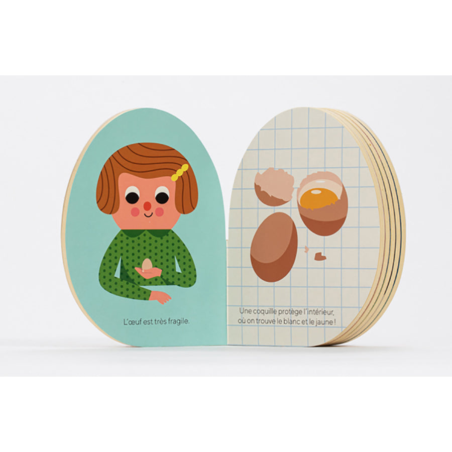Le livre l'Œuf avec ses jolies illustrations édité par Marcel et Joachim, la maison d'édition indépendante pour la jeunesse. Un livre fabriqué avec d'épaisses pages en mousse en forme d' œuf pour découvrir cet aliment, ses origines et ses différentes utilisations.