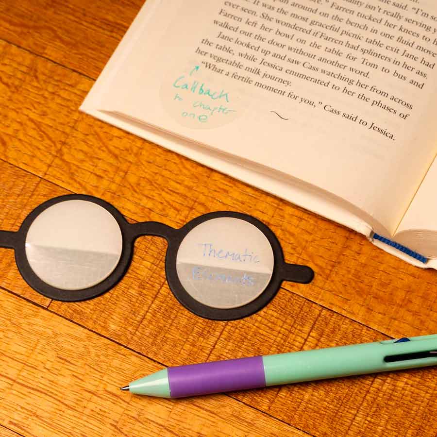 Hello la team Kumo, aujourd’hui on vous présente ces notes autocollantes ludiques de chez Kikkerland. Celles-ci prennent la forme d’une paire de lunettes rondes, avec deux mini blocs de post-its transparents (un par "verre"). Chaque bloc contient 50 feuilles autocollantes certifiées FSC, soit 100 notes au total.