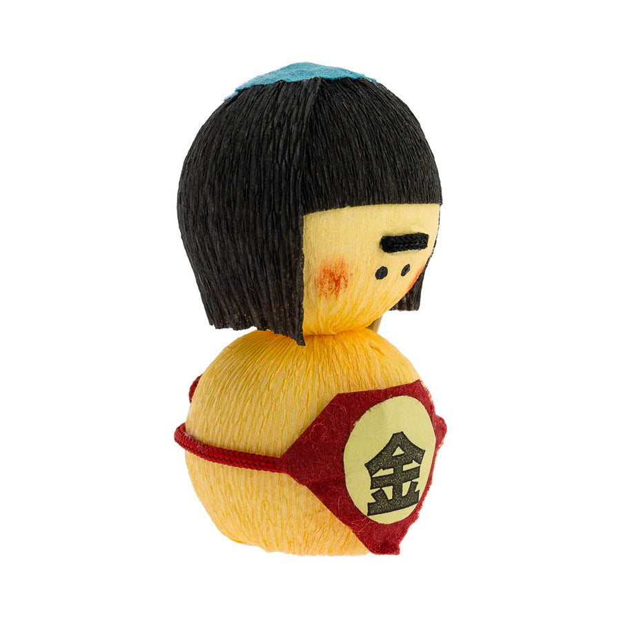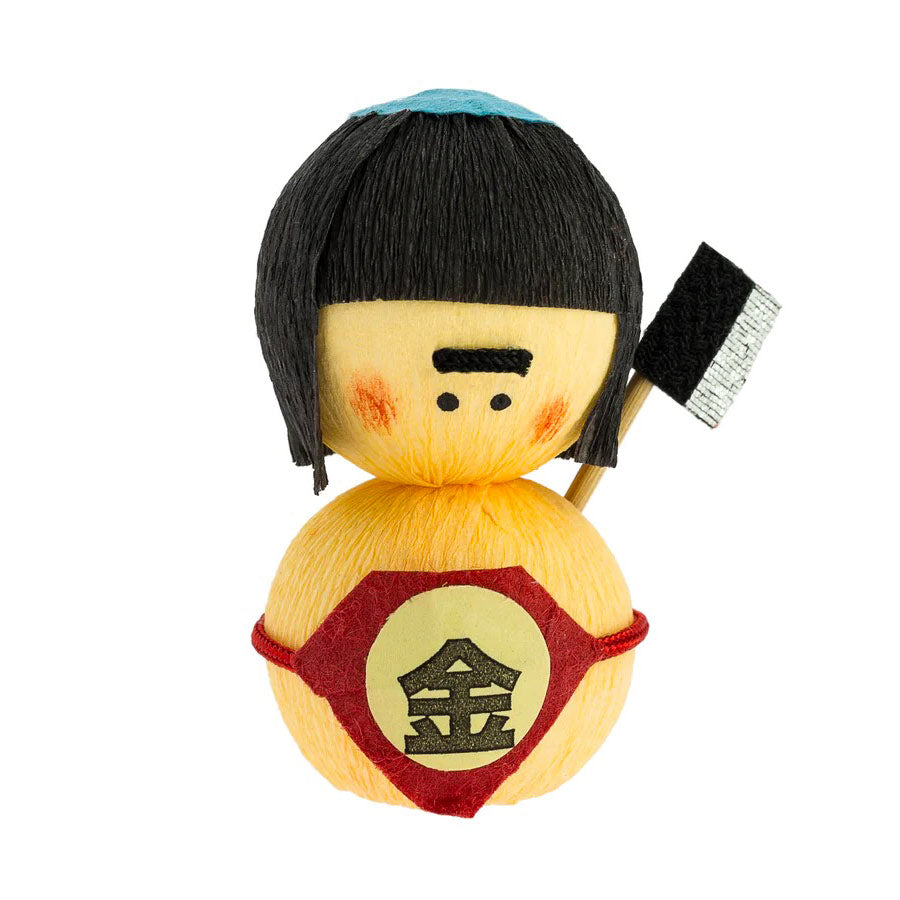 Cette figurine est une représentation de Kintaro qui signifie "enfant doré". C'est une figure légendaire du folklore japonais. On le représente souvent comme un enfant robuste et puissant avec une hache pour l'associer à la bravoure et à la force. Il porte notamment comme seul habit, une bavette rouge avec l'idéogramme chinois "or" inscrit dessus. Symbole de la persévérance et du courage, c'est un chef reconnu et respecté maîtrisant les arts martiaux. Il existe un temple dédié à Kintaro pas loin de Tokyo où l'on retrouve un énorme rocher fendu en deux. On dit que c'est l'oeuvre du fameux garçon doré.