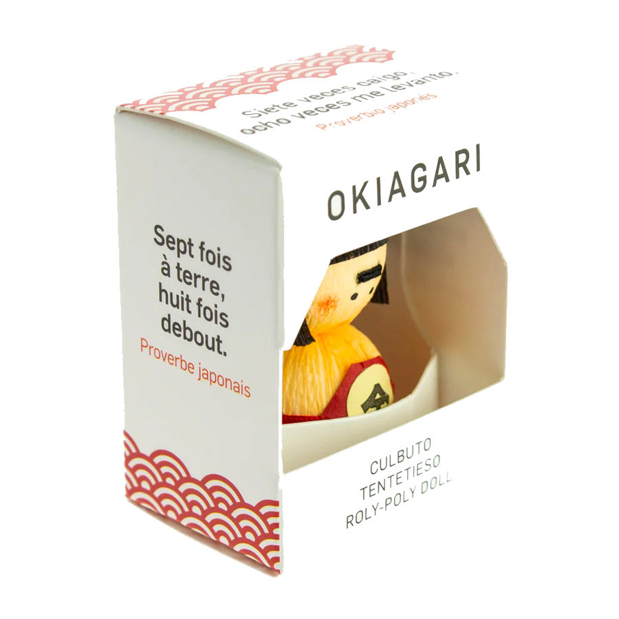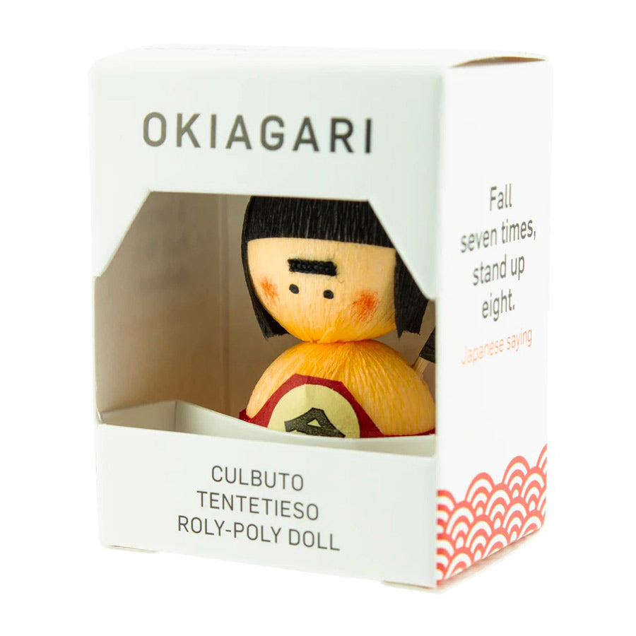 Okiagari-koboshi veut dire littéralement petit prêtre se mettant debout. Il s’agit d’un culbuto traditionnel japonais fait de papier mâché et conçu de telle façon à toujours revenir en position verticale lorsqu'il est incliné sur le côté.