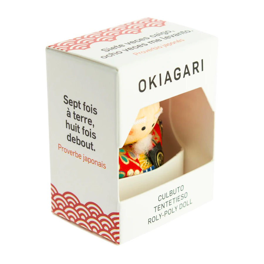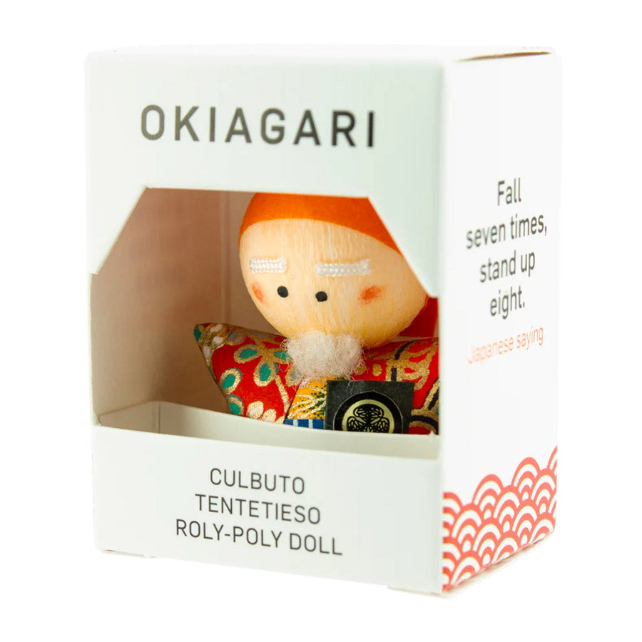 Okiagari-koboshi veut dire littéralement petit prêtre se mettant debout. Il s’agit d’un culbuto traditionnel japonais fait de papier mâché et conçu de telle façon à toujours revenir en position verticale lorsqu'il est incliné sur le côté.