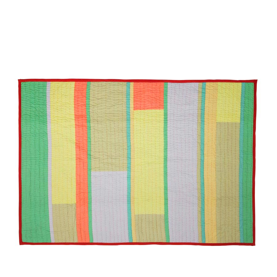 Chaque bande de couleur semble avoir été découpée et assemblée à la main, à la manière d’un patchwork contemporain, ce qui donne au plaid tout son charme. Autre détail qu’on adore : les surpiqûres visibles qui parcourent toute la surface. Inspirées de la technique de la courtepointe, elles ajoutent du relief, de la texture et renforcent ce côté artisanal.