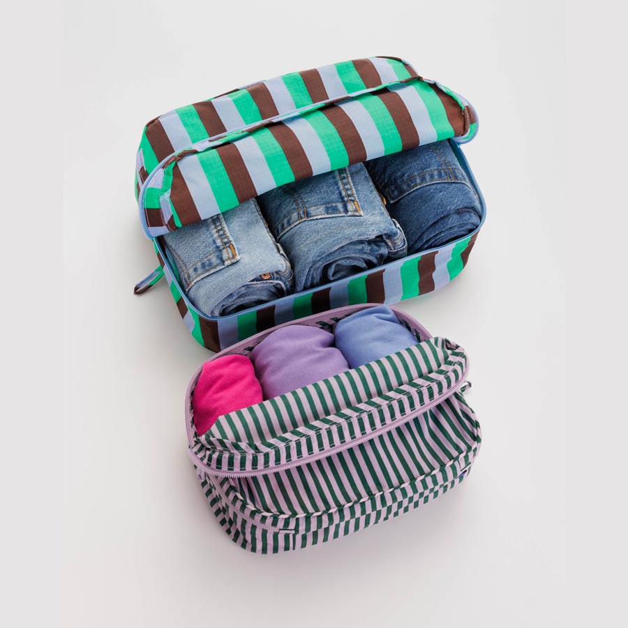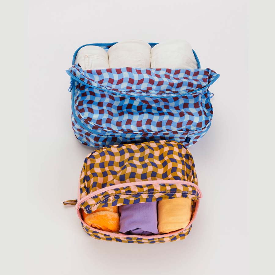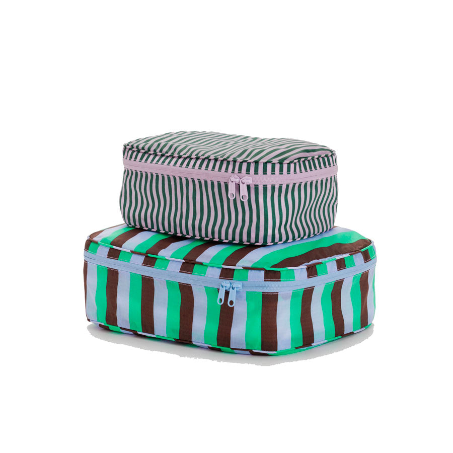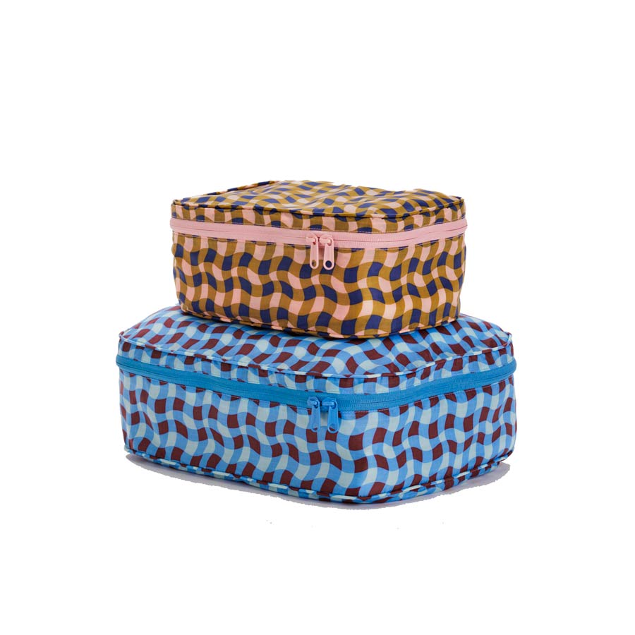 Triez et organisez vos vêtements avec ce set de 2 pochettes de voyage en forme cubique. Fabriqué en nylon recyclé, ce lot se décline dans deux tailles et deux couleurs différentes, à glisser directement dans la valise ou pour mettre de l'ordre dans votre placard !