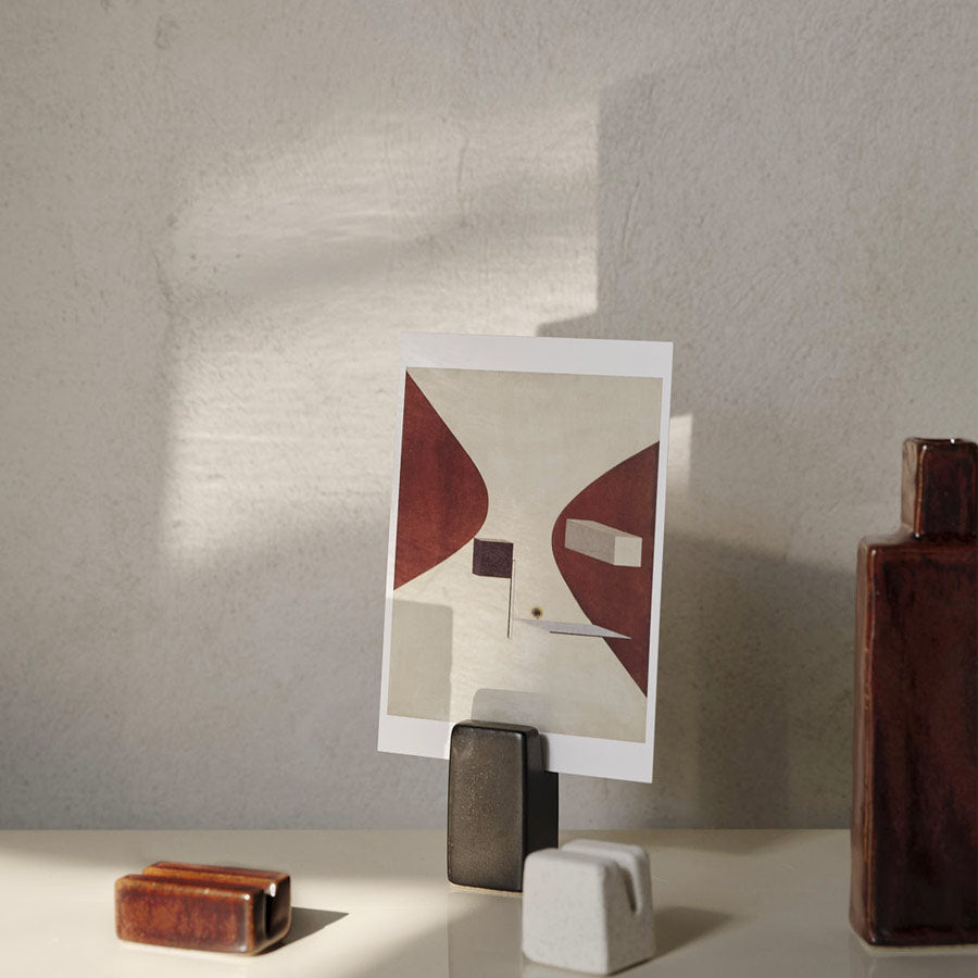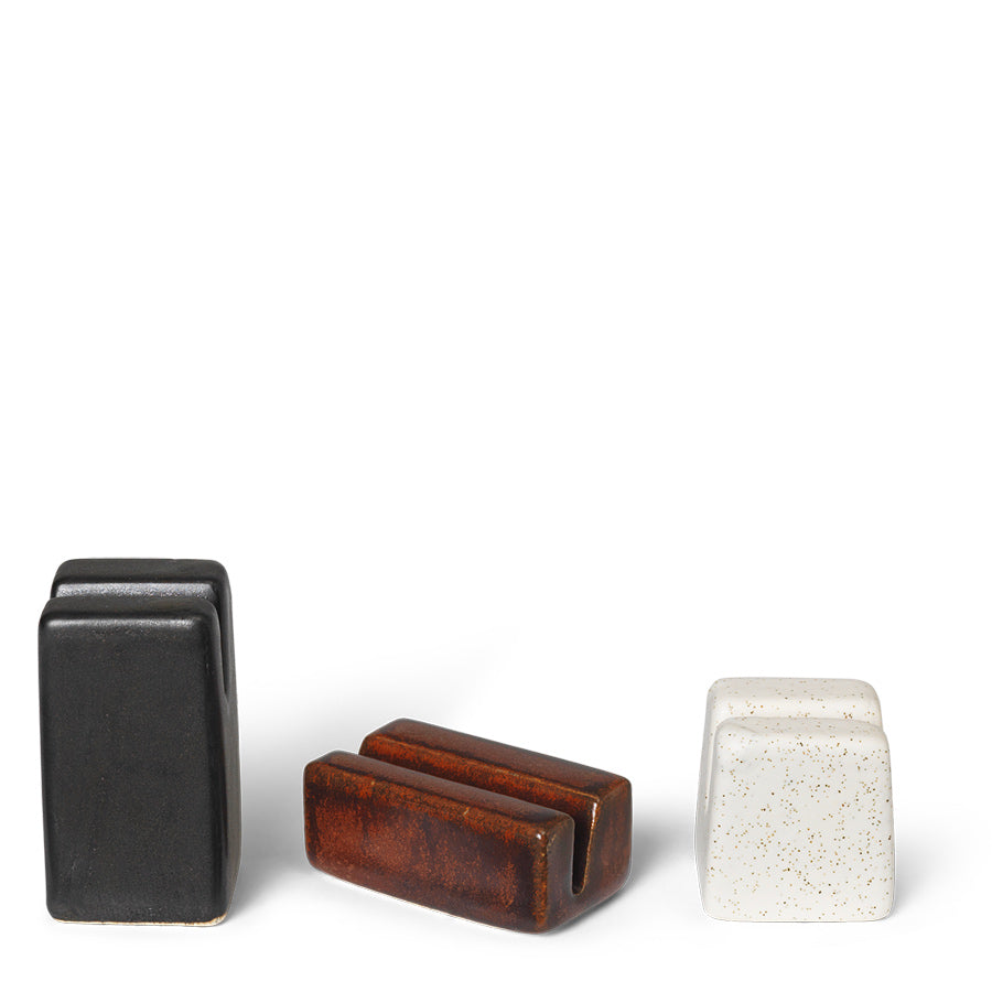 Minimalistes, sculpturaux et ultra élégants, ces 3 porte-cartes en céramique émaillée signés Ferm Living sont aussi beaux qu’utiles. Leur design en trio de tailles et de couleurs (noir, blanc cassé et rouge brun) apporte une touche graphique à votre bureau, votre bibliothèque ou votre table de fête.