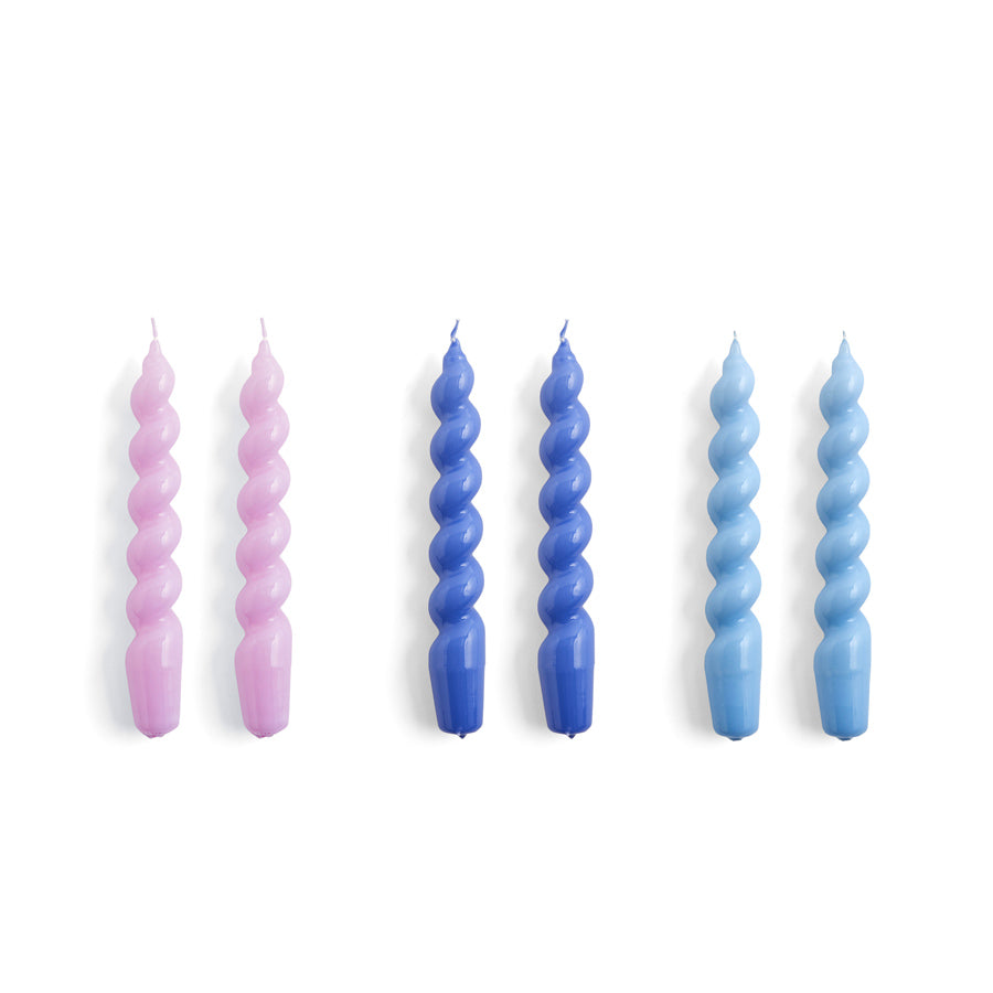 Set de 6 bougies spirales épaisses lilas, bleu violet et bleu clair