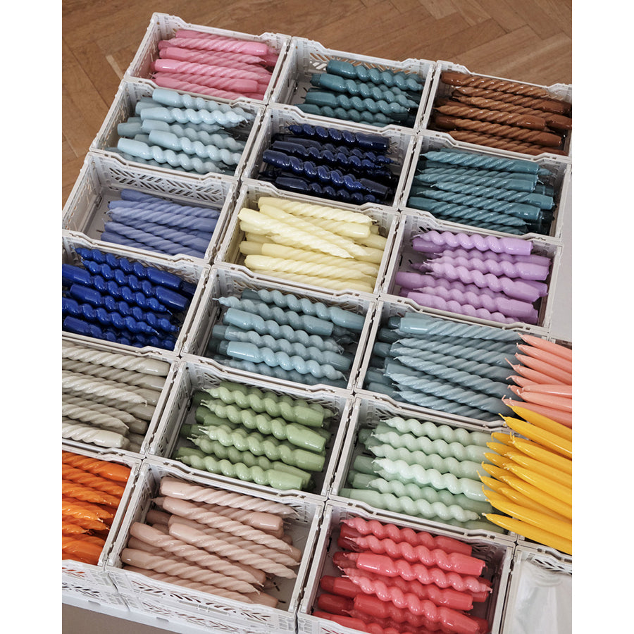 Très tendances, ces bougies torsadées se déclinent dans une jolie palette de trois couleurs : lilas, bleu violet et bleu clair. Elles s'adapteront aux bougeoirs d'au moins 2,6 cm. Ce set de six bougies spirales épaisses apportera de l’originalité à vos bougeoirs et chandeliers.