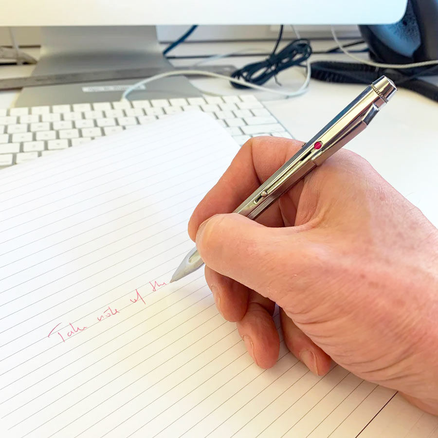 Découvrez ce stylo 3 couleurs plus un porte-mines de la marque Kikkerland !
