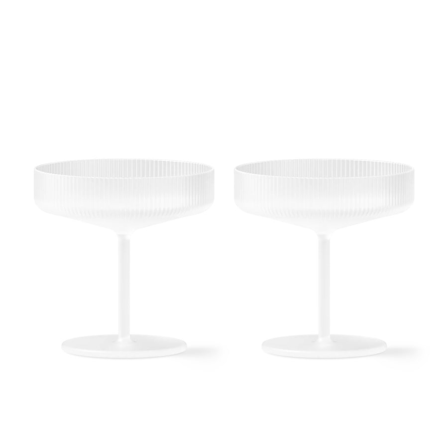 Cet ensemble de verres à champagne givré de la marque Ferm Living est issu de la collection Ripple. Dotés d'une surface ondulée, ils sont faits de verre délicat soufflé à la bouche dans un moule, ajoutant une expression dynamique et une énergie. Ces coupes de champagnes peuvent également servir de coupe à dessert.