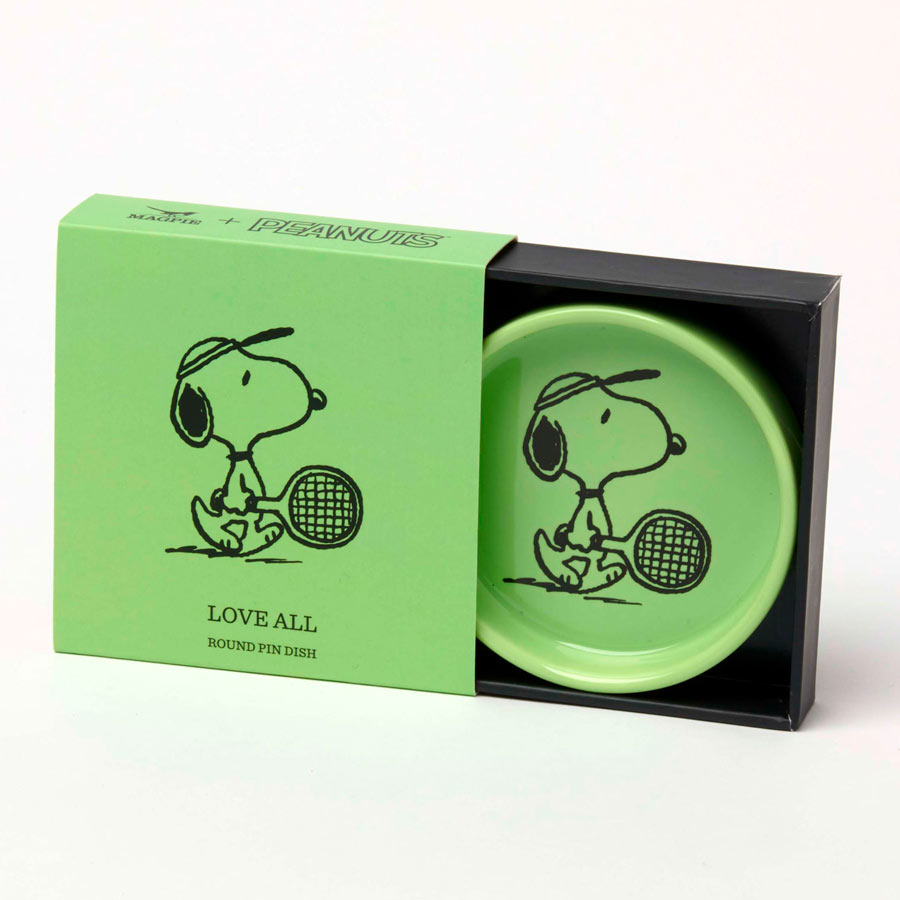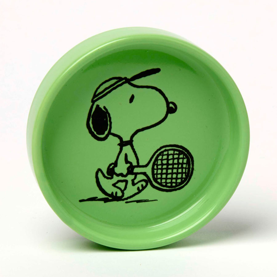 Découvrez le vide-poche rond Peanuts de chez Magpie. Fabriqué en céramique, on retrouve sur ce joli support vert, Snoopy portant une casquette avec une raquette de tennis à la main.